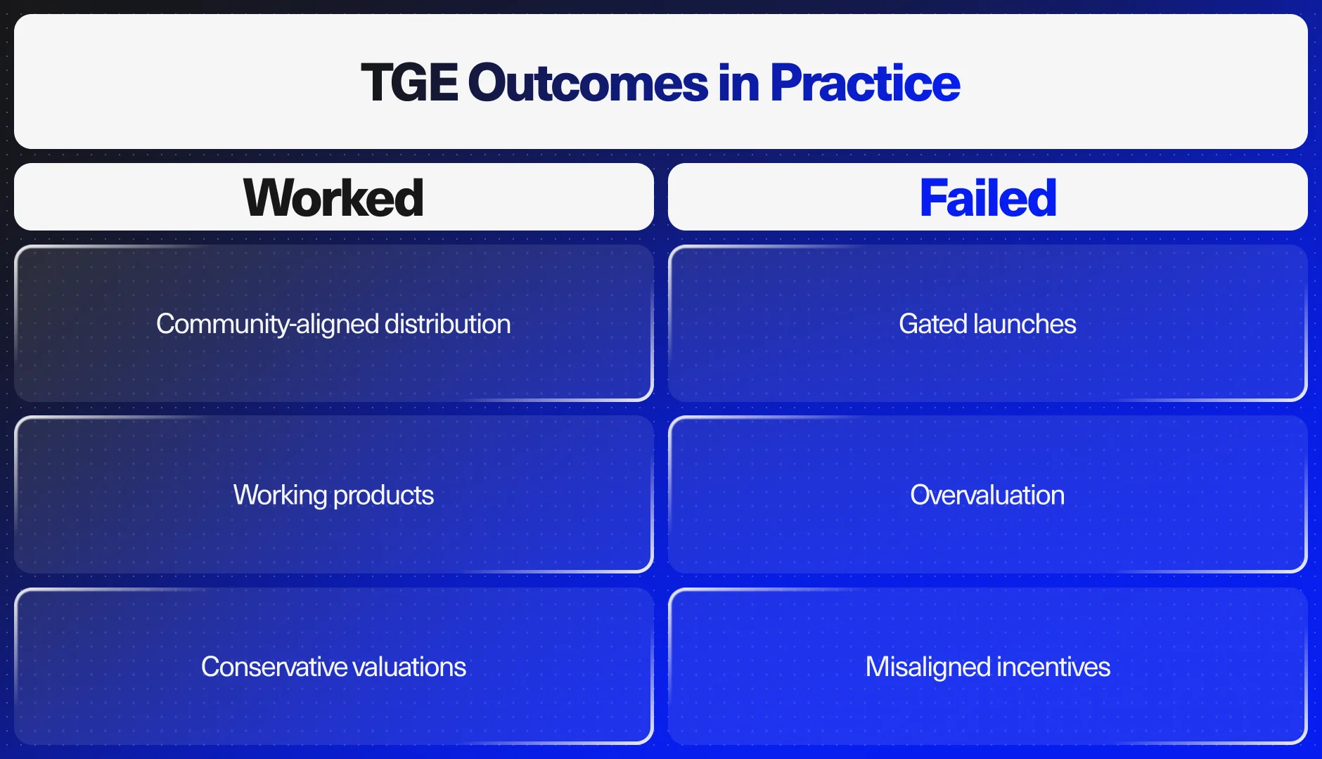 - Most TGEs fail due to weak fundamentals, not lack of attention