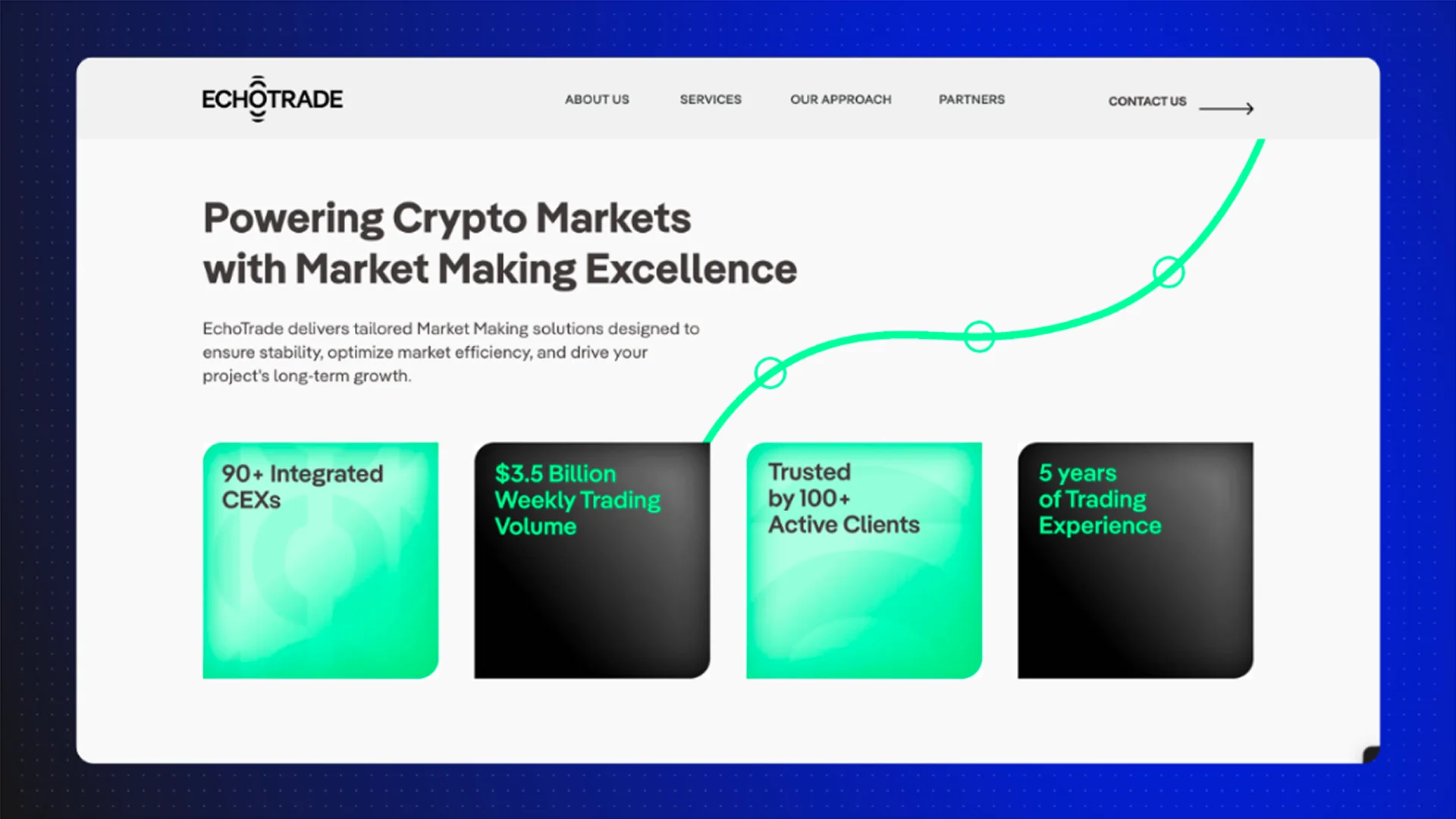 EchoTrade positions itself as a market maker that combines liquidity support with exchange listing help, treasury-building strategies, and consulting on tokenomics and trading. It describes a high-frequency trading setup supported by quantitative research and low-latency infrastructure. EchoTrade manages $3.5 billion in weekly trading volume, supports 90+ exchange integrations, and works with more than 100 active clients.