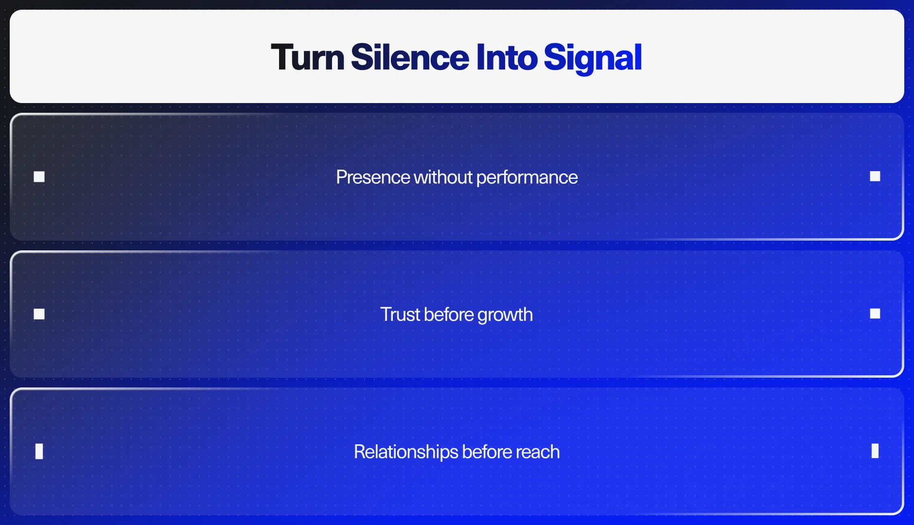 - Stop performing for reach; start relating for resonance