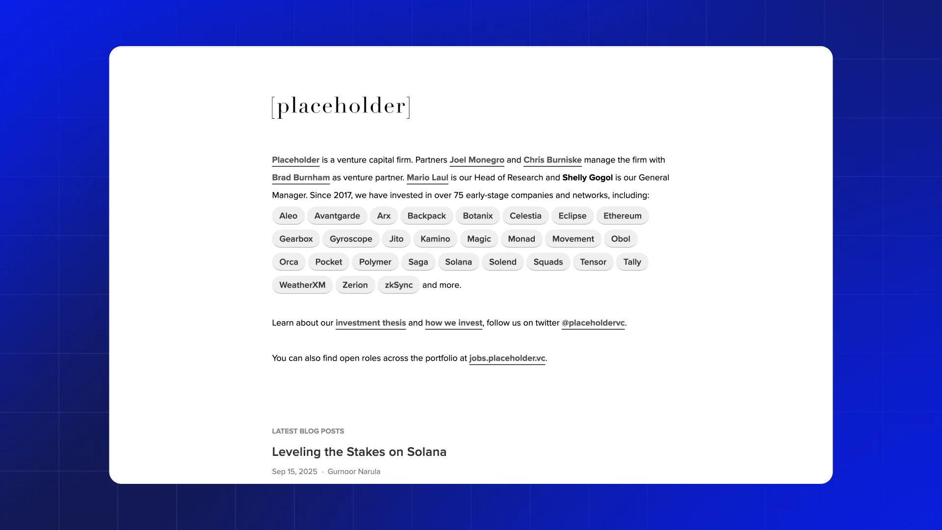 Placeholder is a venture capital firm that specializes in investing in decentralized protocols and web3 services. The firm is managed by partners Joel Monegro and Chris Burniske, with Brad Burnham serving as a venture partner. The research team consists of Mario Laul as Head of Research and Gurnoor Narula as Research Analyst, while operations are managed by Shelly Gogol and Crystal Kwan.